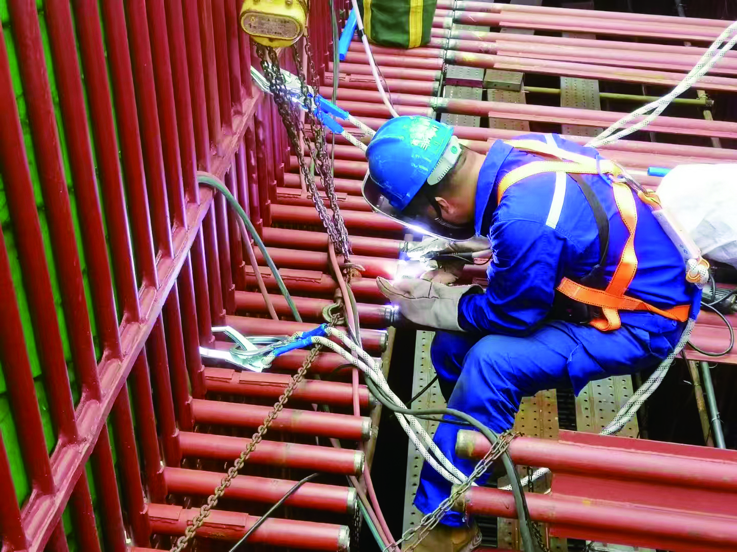 图为江苏帝邦电建分公司承接的河南能信2#锅炉正在紧张安装中