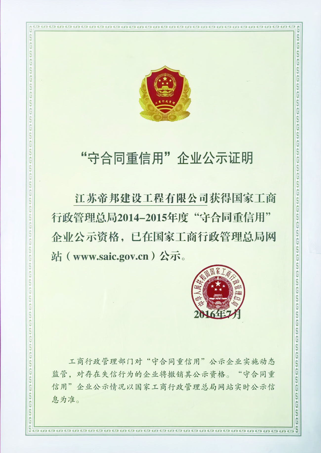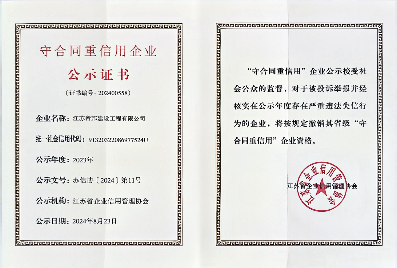 热烈祝贺江苏帝邦获得省级重合同守信用单位